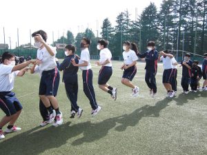 残念ながら、「まん延防止等重点措置」の延長により、学外に出る行事は禁止になりました。そこで、新たに学内のイベントを企画し、本日、中等部1年生はグラウンドでミニ体育祭を実施しました。