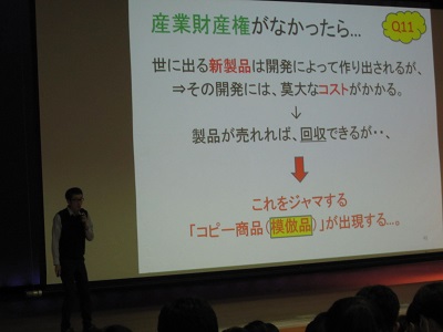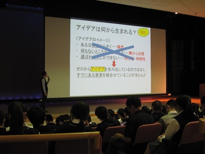 本日6時間目の高校1年生の授業は現代文明論。今日は産業財産権について大ホールで一斉に学習をしました。権利の侵害例として画像で色々な本物と偽物のものを見比べることができ、生徒は納得している様子でした。