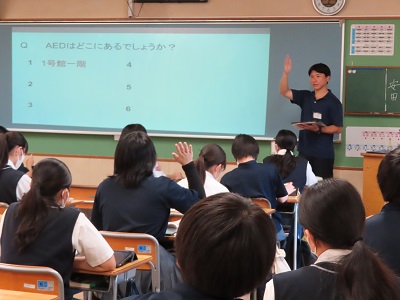 11:00頃、高校2年10組保健体育の授業で教育実習生が心肺蘇生法の授業を行っていました。心肺蘇生法について学習してから校内のAED設置場所を確認し、最後に人形やAEDを用いた心肺蘇生法の実践を行いました。「みんなAEDの機会がやり方知らなくても教えてくれるので、心肺蘇生法をするとしないより2倍生存率が上がるので行ってあげてください」
