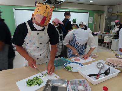 本日調理室で、9:00頃高校2年10組、11:00頃高校2年12組の生徒たちが冷やし中華を作っていました。どの班も出来栄えが良く今日は朝から暑いので、最高に美味しそうでした。
