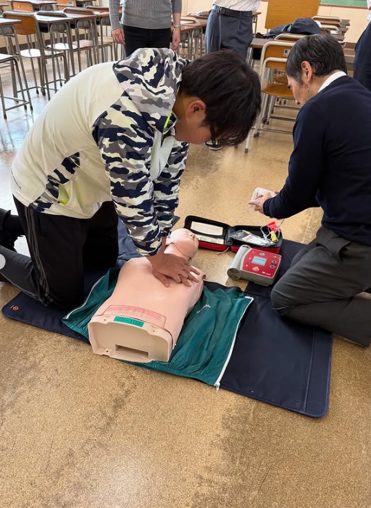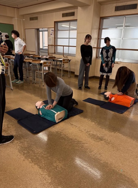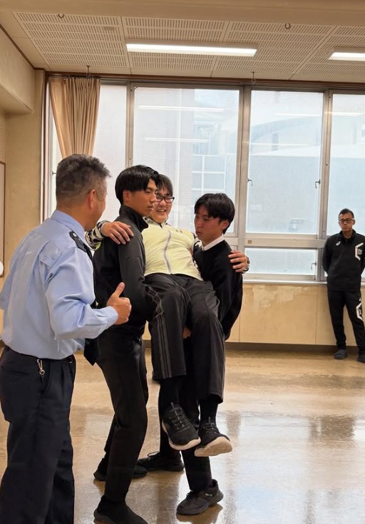日本赤十字社より講師の先生をお迎えし、AEDの使用方法や、担架が無い時のけが人の搬送法などについて学びました。