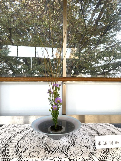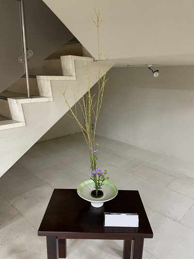 外部講師の先生にご指導いただき、華道同好会生徒たちが作成した今月の作品を廊下に展示しました。