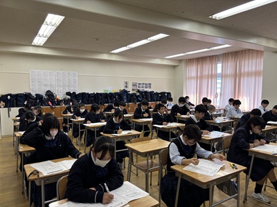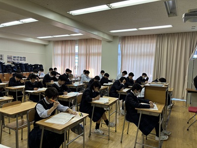 本日、中等部は学力検査を行いました。国語、数学、社会、英語、理科の5教科で、皆真剣に取り組んでいます。