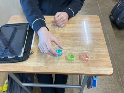 この日、「栄養」チームの生徒たちは、自身の探究活動の成果論文に必要な実験に取り組みました。机上に並べられたのは、何やらカラフルな「色水」。実はこれ、かき氷のシロップです。生徒たちは、目隠しをしたり、鼻をつまんだりしながら試飲し、「視覚」や「嗅覚」が味覚に与える影響を検証していました。