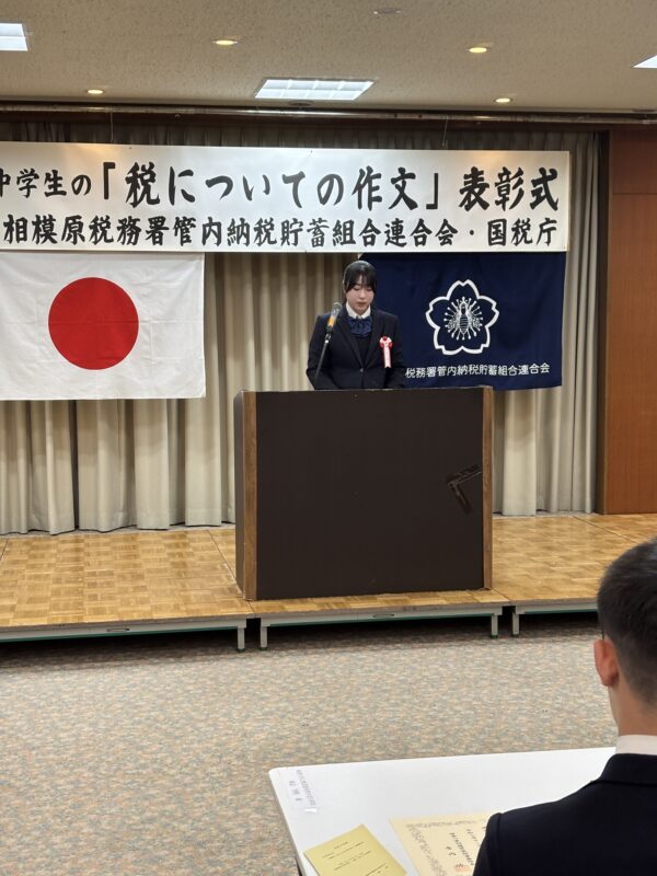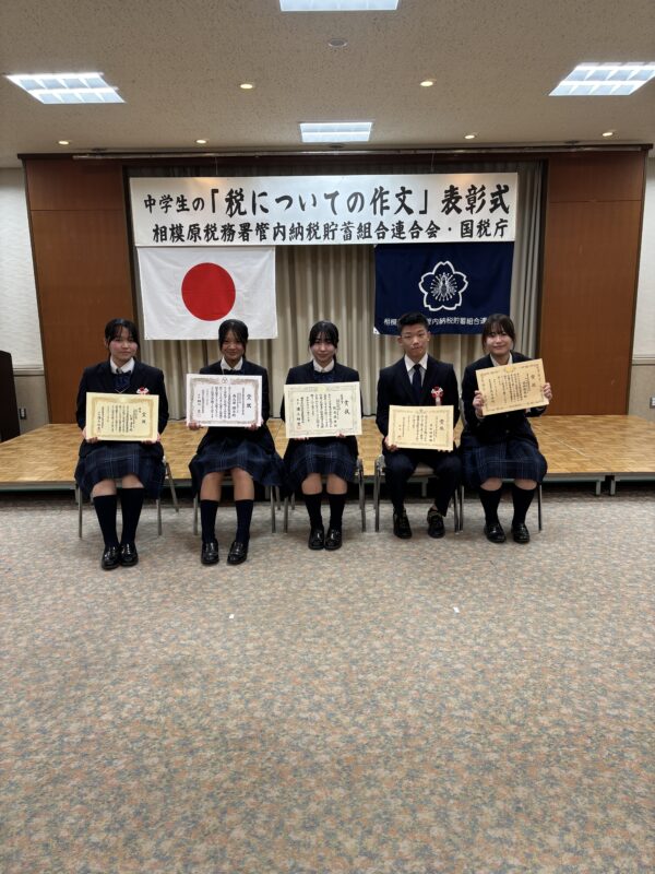 12月3日(水)、相模原市民会館において令和7年度「税についての作文」入選者の表彰式が行われました。この作文事業は、全国納税者貯蓄組合連合会および国税庁が主催し、税への理解や関心を高めることを目的として実施されています。本校からは、以下の5名が入賞しました。