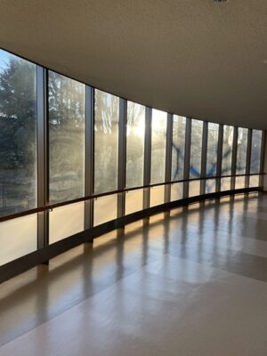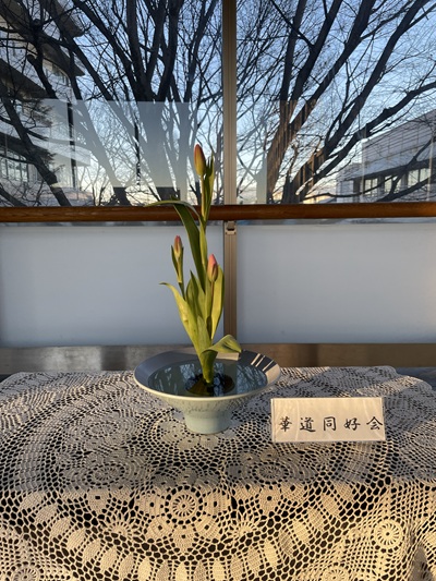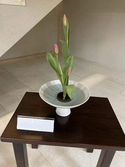 外部講師の先生にご指導いただき、華道同好会生徒たちが作成した今月の作品を廊下に展示しました。