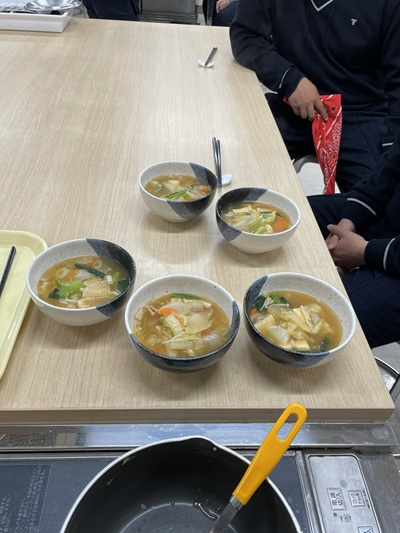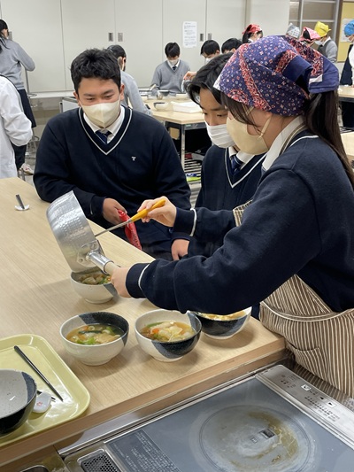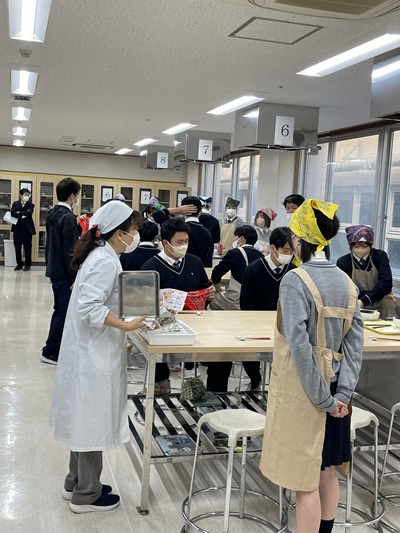 昨日、高校2年生家庭基礎の授業で家庭科が研究授業を実施し、調理室で生徒たちはすいとんを調理しました。衛生管理に配慮した調理の実践はもちろん、災害時にも対応できる調理方法を理解し、どのような備えや対策が必要かを考えました。