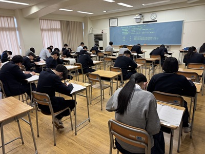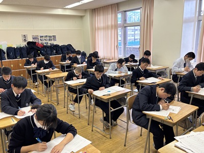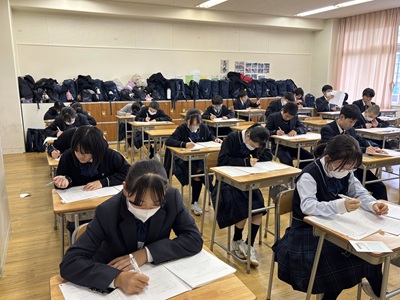 本日、中等部では5・6時間目を使用し、数学検定を実施しました。本校では日頃の授業に加え、各種検定への挑戦を通して、基礎学力の定着と学力向上に力を入れています。生徒たちはこれまでの学習の成果を発揮しようと、最後まで集中して問題に取り組んでいました。主体的に学ぶ姿勢を育み、確かな学力の育成に努めてまいります。