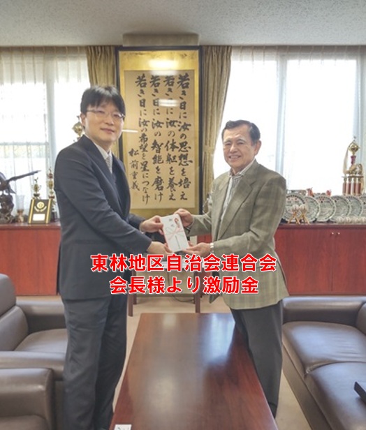 東林地区自治会連合会 田村会長より、25年度に全国大会出場を決めた部活動全体への激励金をいただき、本日校長室で贈呈されました。