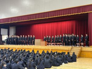 中高合同の終業式、離任式に続いて高校1,2年の表彰式が行われました。表彰式では優等賞、進歩賞、1ヶ年皆勤賞、松前重義賞に多くの受賞者が表彰されました。壮行会では全国大会に出場する柔道部、男子剣道部、女子剣道部、男子ソフトテニス部、洋弓部に生徒会長から激励の言葉がありました。クラブ表彰では放送部が第60回神奈川県高校放送アンデパンダン大会SV部門で優勝し、表彰されました。